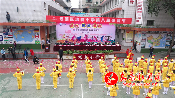 開幕式上,培新小學(xué)宣傳隊(duì)隊(duì)員護(hù)衛(wèi)著;蘸腕w育節(jié)會(huì)標(biāo)向主席臺(tái)走來,各年級(jí)表演隊(duì)陸續(xù)入場,他們用啦啦操、跆拳道、賽龍舟等多種形式的表演將開幕式推向高潮,高年級(jí)鼓旗隊(duì)更是振奮人心,旗幟在操場上變換各種造型圖案,預(yù)示著培新生生不息,鼓聲鏗鏘有力的節(jié)奏催促著培新人大膽創(chuàng)新,銳意進(jìn)取。