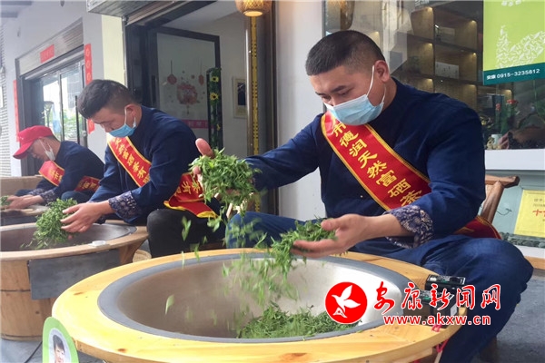 活動現(xiàn)場,三口電炒鍋一字排開,三位炒茶師傅雙手翻飛,嫩綠的鮮葉在他們手中滾動擠壓,揉捻、殺青、焙烘......最終成為我們常見的毛尖茶葉。