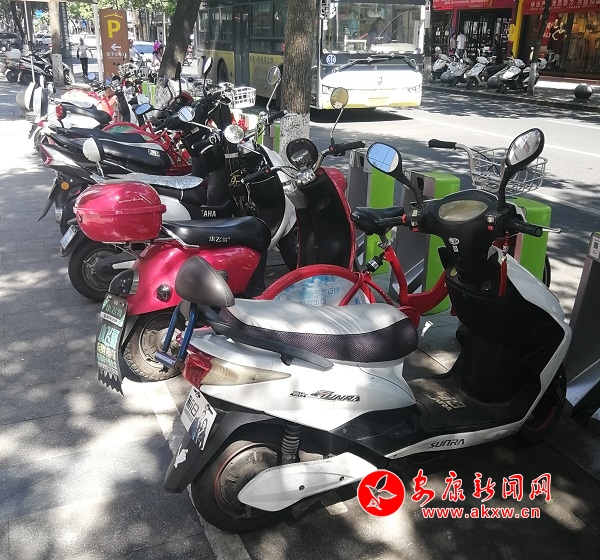 本網(wǎng)訊(記者 牟慶紅)7月31日,記者在興安中路一商城門前發(fā)現(xiàn),大量摩托車、電動(dòng)車扎堆停放在城市公共自行車樁旁,使得公共自行車無(wú)法?。