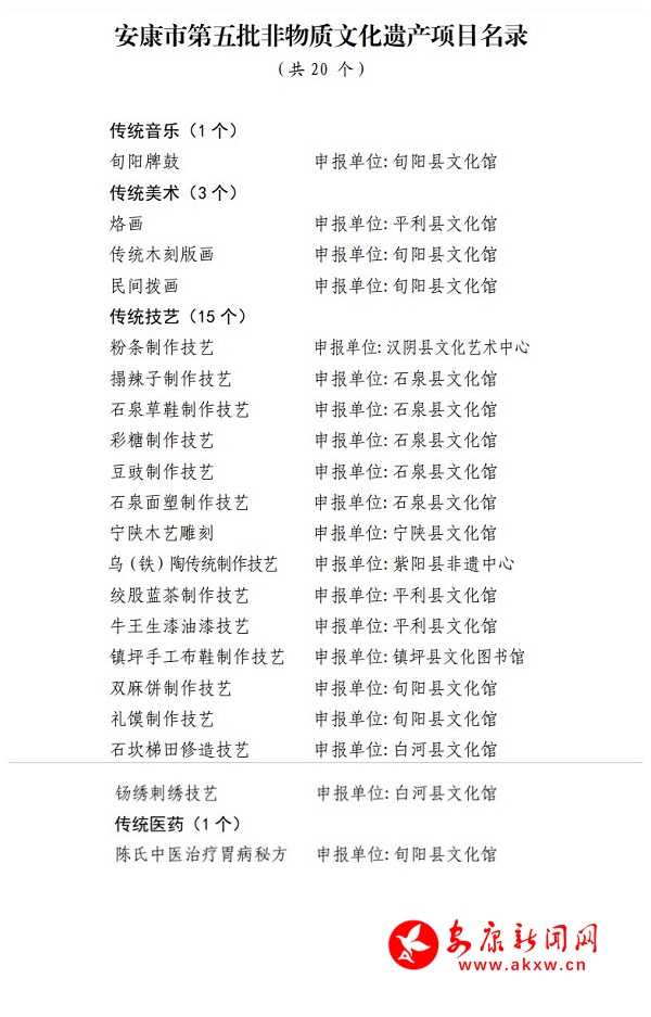 本網訊(實習記者 殷婷 楊一 )近日,安康市第五批非物質文化遺產項目名錄公布。按照《中華人民共和國非物質文化遺產法》和《陜西省非物質文化遺產條例》相關規(guī)定,經申報、評審、公示等程序,“旬陽牌鼓”等四大類20 個項目被列入該名錄,具體名單如下:Ftx安康新聞網