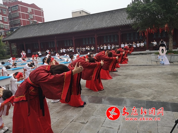 據(jù)了解,“開(kāi)筆禮”是中國(guó)古代人生“四大禮”之首,是蒙童入學(xué)階段極為重要的儀式。“開(kāi)筆禮”儀式主要分成六項(xiàng)內(nèi)容,每一項(xiàng)內(nèi)容承載著特定的教育目的。“正衣冠”要求學(xué)子們養(yǎng)成干凈整潔的生活習(xí)慣;“感恩鞠躬”讓學(xué)子向師長(zhǎng)行揖禮,謝師恩、謝親恩,并為師者和長(zhǎng)輩奉茶,讓他們從小懂得孝親尊師的道理;“凈手凈心”讓學(xué)子們從此靜心讀書(shū),心無(wú)旁騖;“朱砂啟智”,表達(dá)了師長(zhǎng)對(duì)學(xué)子們的美好祝愿,希望他們心明眼亮,聰慧過(guò)人;“擊鼓明志”讓學(xué)子們樹(shù)立遠(yuǎn)大的理想與目標(biāo);“開(kāi)筆啟蒙”書(shū)寫(xiě)“人”字,學(xué)會(huì)做人的道理。蒙童通過(guò)親身經(jīng)歷這種莊嚴(yán)古樸的儀式,實(shí)現(xiàn)從蒙童到學(xué)生的心理過(guò)渡。