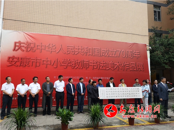 本網訊(實習記者 雷文鈺)為慶祝中華人民共和國成立70周年,安康市中小學教師,用一份特殊的禮物向偉大的祖國獻禮,9月24日上午,由安康市教育體育局主辦,安康市教研室、陜西省安康中學、安康市教育學會、安康市中小學美術教育研究會承辦,安康市書法家協(xié)會、安康市群藝館、陜西省于右任書法學會安康分會、陜南畫院協(xié)辦的“輝煌七十載,筑夢新時代”慶祝新中國成立七十周年安康市中小學教師書法美術作品展在安康中學美術館啟幕。