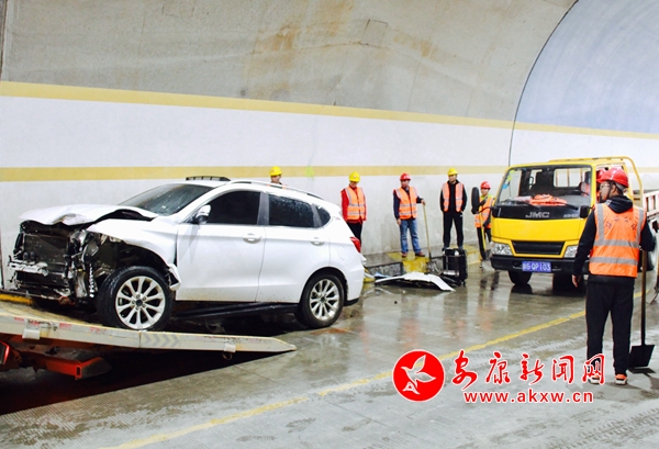 14時30分,隨著總指揮一聲令下,各工作小組立即投入搶險,救護(hù)車、消防車、裝載車、工程車紛紛進(jìn)入現(xiàn)場開展救援作業(yè)。交通管制組對隧道嵐皋方向和民主方向繞行道路路口封閉交通和分流車輛,在繞行路口設(shè)立安全警示標(biāo)志、限速標(biāo)志、導(dǎo)向標(biāo)志、錐形標(biāo)志等;消防救援組設(shè)立臨時救護(hù)點救援被困人員,并對起火車輛進(jìn)行泡沫覆蓋滅火;事故勘察組攜帶勘查設(shè)備、工具對現(xiàn)場進(jìn)行勘查拍照取證、測量繪制現(xiàn)場圖樣,同時提取、采集相關(guān)痕跡、物證;環(huán)境監(jiān)測組對大氣環(huán)境進(jìn)行實時檢測,及時向指揮部報告實時監(jiān)測數(shù)據(jù);現(xiàn)場清理及維護(hù)組配合路面養(yǎng)護(hù)作業(yè)車、灑水作業(yè)車等機械及時對隧道內(nèi)事故現(xiàn)場進(jìn)行了清理、清掃,并在損壞設(shè)施附近設(shè)立安全警示標(biāo)志。經(jīng)過緊張有序救援,柏枝埡隧道突發(fā)事故點救援應(yīng)急演練圓滿完成,現(xiàn)場宣布解除交通管制,恢復(fù)正常交通。