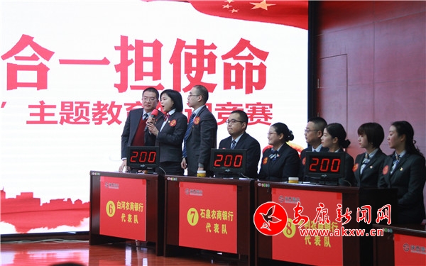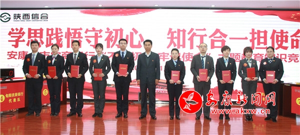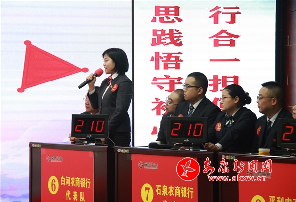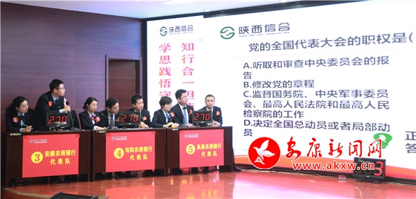據(jù)了解,本次活動(dòng)以“學(xué)思踐悟守初心,知行合一擔(dān)使命”為主題,以習(xí)近平新時(shí)代中國(guó)特色社會(huì)主義思想、黨的十九屆四中全會(huì)精神、黨章黨規(guī)、掃黑除惡專(zhuān)項(xiàng)斗爭(zhēng)應(yīng)知應(yīng)會(huì)知識(shí)等為競(jìng)賽內(nèi)容,設(shè)置必答、搶答、風(fēng)險(xiǎn)、加試等環(huán)節(jié)進(jìn)行,來(lái)自安康各縣區(qū)農(nóng)商行10個(gè)代表隊(duì),共30名選手參與競(jìng)答。賽場(chǎng)上,氛圍緊張激烈,你追我趕,尤其在搶答題環(huán)節(jié),搶答令一經(jīng)發(fā)出,各隊(duì)選手立即開(kāi)始爭(zhēng)相搶拍競(jìng)答器,比分稍微落后的隊(duì)伍在搶到答題權(quán)后,出色作答后贏得現(xiàn)場(chǎng)陣陣掌聲,即使答錯(cuò),選手們也毫不氣餒,互相鼓勵(lì),立即調(diào)整狀態(tài)準(zhǔn)備下一次搶答。比賽現(xiàn)場(chǎng)精彩紛呈,觀眾不時(shí)為選手們精準(zhǔn)的回答報(bào)以熱烈的掌聲。