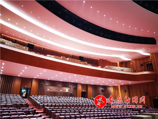 大廳右側(cè)為大劇場,左側(cè)為小劇場。大劇場的舞臺長33.6米,高24.2米,舞臺正前方配有一個長14.3米、寬13.3米的升降舞臺,劇場內(nèi)可同時(shí)容納1200人觀看演出。小劇場舞臺長18.3米,高11.3米。共有座位307個,內(nèi)部設(shè)施安裝已基本完成。