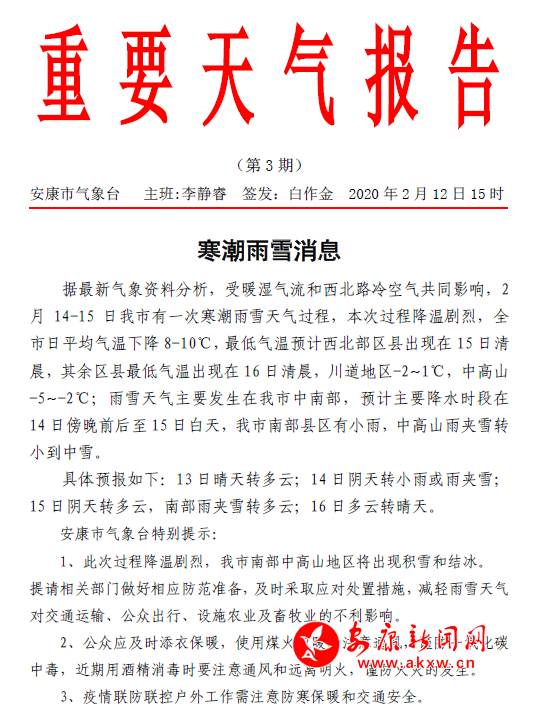 預計西北部區(qū)縣最低氣溫出現(xiàn)在15日清晨,其余區(qū)縣最低氣溫出現(xiàn)在16日清晨,川道地區(qū)-2~1℃,中高山-5~-2℃;雨雪天氣主要發(fā)生在我市中南部,預計主要降水時段在14日傍晚前后至15日白天,我市南部縣區(qū)有小雨,中高山雨夾雪轉小到中雪。