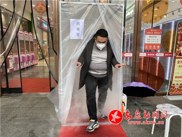 記者來到位于金州路的金坊國際購物廣場,該商場門口設(shè)置有一個(gè)顯眼的消毒室,前來購物的顧客須先測量體溫,然后進(jìn)入消毒室消毒五秒以上,完成消殺過程,才能進(jìn)去商場選購貨品。