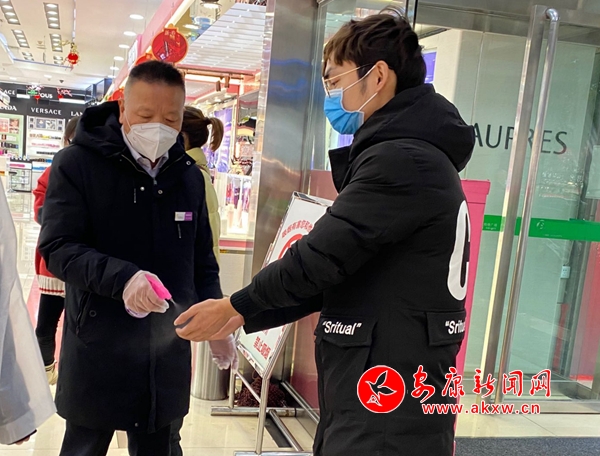 記者來到位于金州南路的時(shí)代購物廣場,觀察到店門口設(shè)有專門的測溫點(diǎn),每個(gè)前來的顧客都需要先進(jìn)行體溫測量,然后由工作人員對顧客的手部進(jìn)行消毒,盡量保證顧客在選購貨品的時(shí)候不會(huì)產(chǎn)生交叉感染。同時(shí),地上鋪有消毒地墊,每個(gè)顧客都需要踏上去對鞋底就行消毒。
