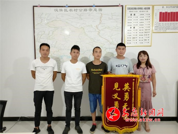 8月20日上午,周女士帶著家人一起來到漢濱區(qū)農(nóng)村公路管理局南區(qū)養(yǎng)護公司感謝四名公路英雄,并將寫有“見義勇為 英勇無畏”的錦旗送給了陳超、陳光飛、艾全軍、鄭小豪四人,感謝他們英勇無畏救其性命,救她順利脫險!