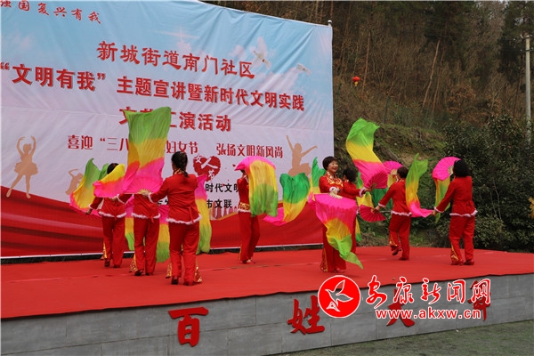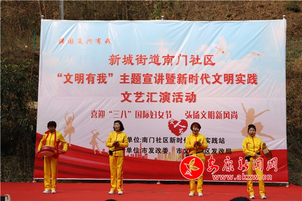 本網(wǎng)訊(記者 趙漪湉)為傳播文明理念,弘揚(yáng)時(shí)代新風(fēng),鞏固和提升創(chuàng)建全國文明城市工作成果,3月6日,市發(fā)改委、市文聯(lián)、漢濱區(qū)發(fā)改局、新城街道南門社區(qū)新時(shí)代文明實(shí)踐站聯(lián)合在南門社區(qū)成功舉辦“文明有我”主題宣講暨新時(shí)代文明實(shí)踐站文藝匯演。zDw安康新聞網(wǎng)