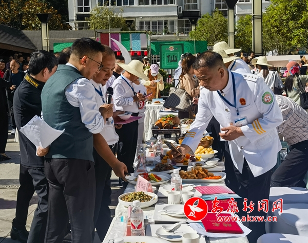 活動現(xiàn)場,來自八仙鎮(zhèn)各村組的19組選手,紛紛拿出自己的看家絕活,在現(xiàn)場設置的灶臺前,煎、炸、煮、蒸、炒,各式烹飪手法齊上陣,金銀蛋卷、洋芋粑粑炒臘肉、天蒜土豆絲、天麻烏雞湯一道道美味佳肴精彩亮相。