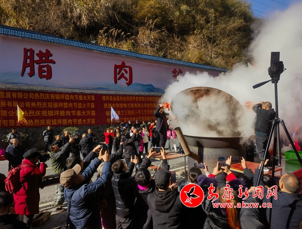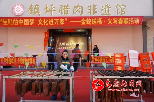 “喝口臘肉湯,給個皇帝都不當!”臘肉節(jié)準備了20個大吊鍋,把大鐵鍋燉的各種臘肉和各種炒菜美食擺成長桌宴,讓到場的嘉賓和群眾共同品嘗。鎮(zhèn)坪臘肉節(jié)不僅僅是一場臘肉美食的集會,更是一種非遺技藝的傳承。活動現(xiàn)場還邀請了陜南民歌傳唱人夏梅子為大家獻唱民歌,并舉辦了“追尋非遺味道”米花糖制作體驗活動和“傳承非遺技藝”拓印美好祝;顒樱约“金蛇送福 文化進萬家”義寫春聯(lián)等活動。gmM安康新聞網(wǎng)