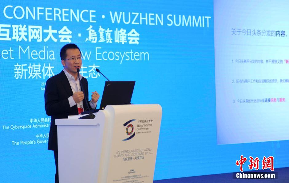 11月19日,今日頭條CEO張一鳴在浙江烏鎮(zhèn)舉行的首屆世界互聯(lián)網大會新媒體分論壇上發(fā)言。當天,世界互聯(lián)網大會在浙江烏鎮(zhèn)拉開帷幕。 中新社發(fā) 李晨韻 攝aa5安康新聞網