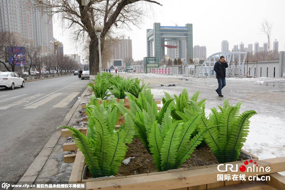 2015年3月15日,吉林省吉林市,在吉林市吉林大街上,市民從形似“油麥菜”的綠色塑料假花前行走。圖片來源:王凱冬tr2安康新聞網(wǎng)