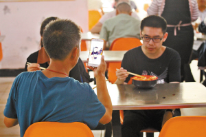 ■一位家長用手機記錄孩子第一次在大學(xué)食堂吃飯。