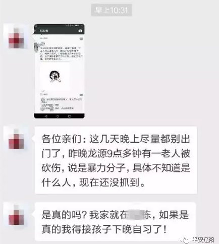 【傳聞】有網(wǎng)傳消息稱,“各位親們,這幾天晚上盡量別出門了,昨晚9點多遼陽龍源有一老人被砍傷,說是暴力分子,具體不知道是什么人,現(xiàn)在還沒抓到”。