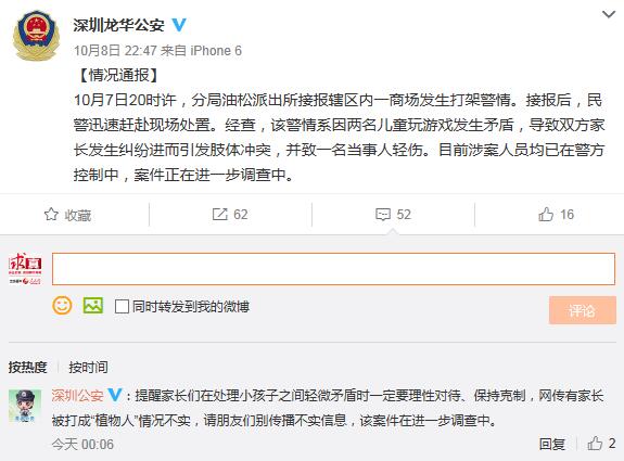 10月8日22時47分,深圳市公安局龍華分局官微對此進行了情況通報。10月7日20時許,分局油松派出所接報轄區(qū)內(nèi)一商場發(fā)生打架警情。接報后,民警迅速趕赴現(xiàn)場處置。經(jīng)查,該警情系因兩名兒童玩游戲發(fā)生矛盾,導致雙方家長發(fā)生糾紛進而引發(fā)肢體沖突,并致一名當事人輕傷。目前涉案人員均已在警方控制中,案件正在進一步調(diào)查中。