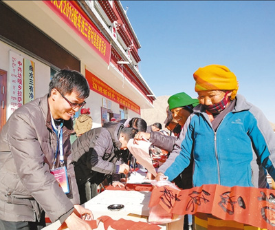 1月7日,第八批援藏干部中的20多名書法愛好者和西藏自治區(qū)書法家協(xié)會部分會員來到位于拉薩河畔的曲水縣三有村,為當(dāng)?shù)?84戶藏漢群眾現(xiàn)場寫福字,送春聯(lián)。a3y安康新聞網(wǎng)