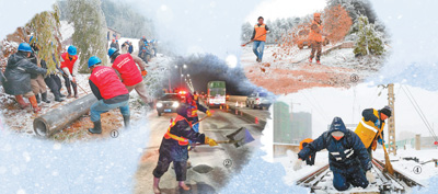 圖④:25日,安徽蚌埠固鎮(zhèn)火車站值班員在清理積雪冰塊。