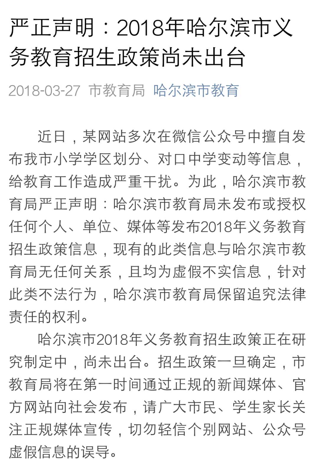 官方聲明表示,近日,某網(wǎng)站多次在微信公眾號中擅自發(fā)布我市小學(xué)學(xué)區(qū)劃分、對口中學(xué)變動等信息,給教育工作造成嚴(yán)重干擾。為此,哈爾濱市教育局嚴(yán)正聲明:哈爾濱市教育局未發(fā)布或授權(quán)任何個人、單位、媒體等發(fā)布2018年義務(wù)教育招生政策信息,現(xiàn)有的此類信息與哈爾濱市教育局無任何關(guān)系,且均為虛假不實信息,針對此類不法行為,哈爾濱市教育局保留追究法律責(zé)任的權(quán)利。cjy安康新聞網(wǎng)