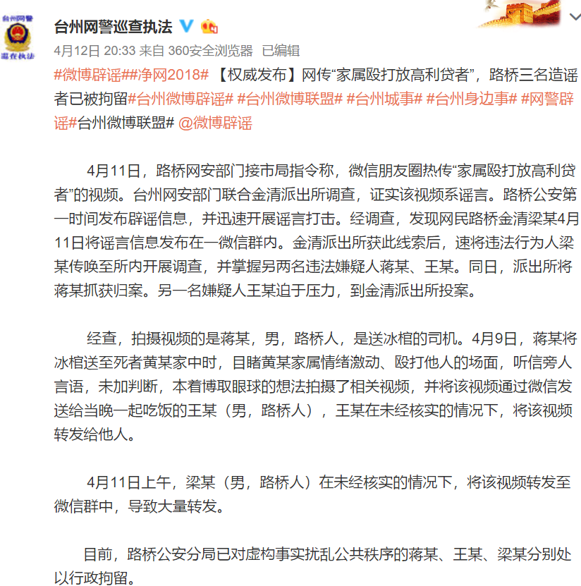 4月12日,臺州網(wǎng)警表示,經查,拍攝視頻的是臺州市路橋區(qū)一男子蔣某,是送冰棺的司機。4月9日,蔣某將冰棺送至死者黃某家中時,目睹黃某家屬情緒激動、毆打他人的場面,聽信旁人言語,未加判斷,本著博取眼球的想法拍攝了相關視頻,并將該視頻通過微信發(fā)送給當晚一起吃飯的路橋區(qū)另一男子王某,王某在未經核實的情況下,將該視頻轉發(fā)給他人。4月11日上午,路橋區(qū)一男子梁某在未經核實的情況下,將該視頻轉發(fā)至微信群中,導致大量轉發(fā)。