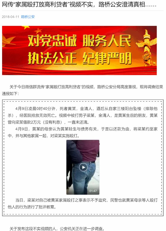 4月11日,據(jù)“路橋公安”官微發(fā)布辟謠消息稱,4月9日凌晨,浙江省臺州市路橋區(qū)金清鎮(zhèn)一黃某,酒后從自家三樓陽臺墜樓(排除他殺),經醫(yī)院搶救無效死亡。視頻中被打男子為金清鎮(zhèn)梁某,是黃某生前的朋友,黃某曾向梁某借款2萬元(沒有利息),一直未還清。當日,黃某的母親認為黃某輕生與債務有關,于是以還款為由,將梁某約至家中,并與其他家屬一起,對梁某實施毆打。事后,梁某對自己被黃某家屬毆打之事表示不予追究,民警也就黃某母親等人毆打他人的行為進行了批評教育。