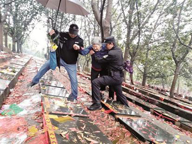 湖北武漢漢陽永豐派出所協(xié)警潘正好介紹,當(dāng)日上午11時許,他和另外一名同事正在公墓內(nèi)巡邏執(zhí)勤時,接到一女子求助,稱南九墓區(qū)有位老人滑倒。他們趕到現(xiàn)場后,先將老人攙扶上了巡邏車。