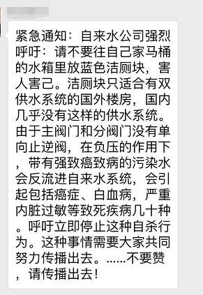 網(wǎng)上熱傳的消息稱,“自來水公司強烈呼吁,請廣大市民不要往自家馬桶的水箱里,放藍色潔廁塊,害人害己,潔廁塊只適合國外有雙供水系統(tǒng)的樓房,國內(nèi)幾乎沒有這樣的供水系統(tǒng),由于主閥門和分閥門,沒有單向止逆閥,在負(fù)壓的作用下,帶有強致癌致病的污染水,會反流進自來水系統(tǒng),會引起包括癌癥,白血病,嚴(yán)重內(nèi)臟過敏等至死疾病幾十種......”