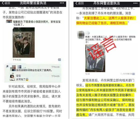 該則消息在沈陽的網(wǎng)民朋友圈中打著“溫馨提示”的名號(hào),聲稱“下圖是偷小孩團(tuán)伙照片,家要有寶寶的注意了”。丹東流傳的版本則為“大家注意此二人,這兩個(gè)人偷孩子的!保利物業(yè)已經(jīng)貼了告示。請(qǐng)相互轉(zhuǎn)告...”