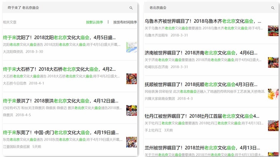 此類消息打出“高品質(zhì)的游玩盛會、高規(guī)格的城市經(jīng)典”的噱頭,聲稱“廟會門票免費送”,呼吁大家“隨手一曬到盆友圈,讓更多的人知道”,并且介紹了舞獅舞龍、二人轉(zhuǎn)、踩高蹺、民俗手工藝等等的廟會活動,鋪排了大量的美食照片,達(dá)到博人眼球的效果。