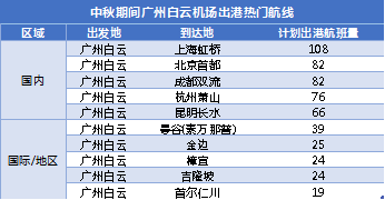中秋期間廣州白云機(jī)場(chǎng)出港熱門航線。CHK安康新聞網(wǎng)