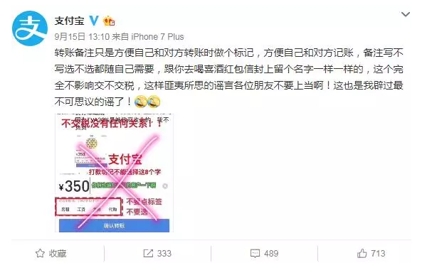 9月15日,“@支付寶”官方微博對此辟謠稱:轉(zhuǎn)賬備注只是方便自己和對方轉(zhuǎn)賬時(shí)做個(gè)標(biāo)記,方便自己和對方記賬,備注寫不寫選不選都隨自己需要,跟你去喝喜酒紅包信封上留個(gè)名字一樣一樣的,這個(gè)完全不影響交不交稅。