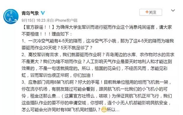 9月15日,青島市專業(yè)氣象臺“@青島氣象”發(fā)布微博辟謠,稱“為確保大學(xué)生軍訓(xùn)而進(jìn)行驅(qū)雨作業(yè)”這個(gè)消息純屬謠言,請網(wǎng)友們不要相信。