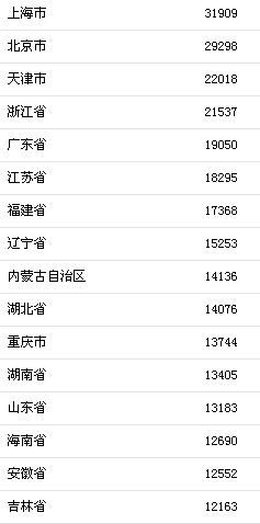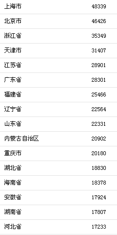 前三季度31省區(qū)市人均可支配收入。來自國家統計局