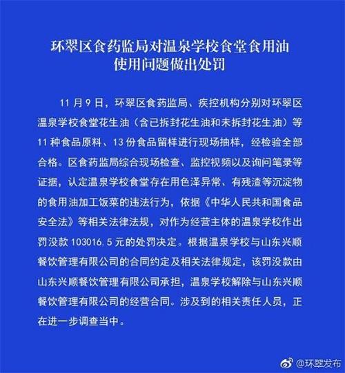 罰款十萬余元,威海環(huán)翠區(qū)食藥監(jiān)對(duì)溫泉學(xué)校食堂食用油問題做出處罰