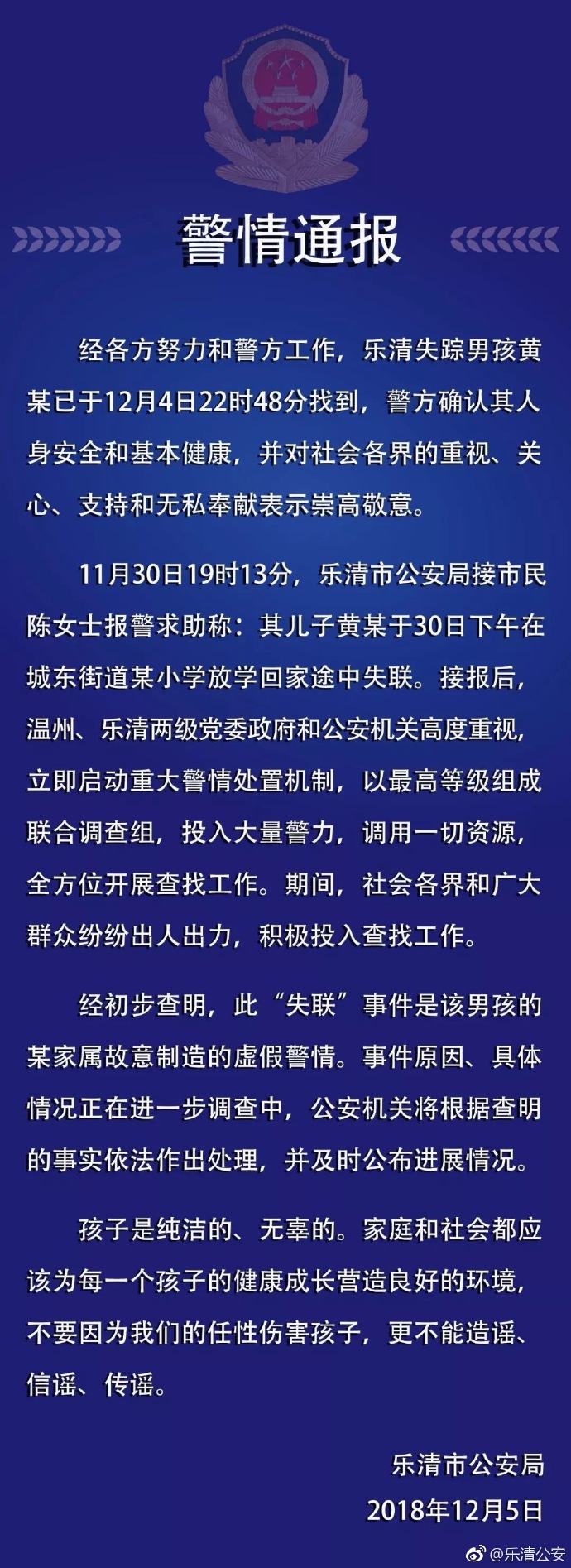 浙江省樂(lè)清市公安局官方微博5日凌晨發(fā)布警情通報(bào)稱(chēng),經(jīng)各方努力和警方工作,樂(lè)清失蹤男孩黃某已于12月4日22時(shí)48分找到,警方確認(rèn)其人身安全和基本健康,并對(duì)社會(huì)各界的重視、關(guān)心、支持和無(wú)私奉獻(xiàn)表示崇高敬意。