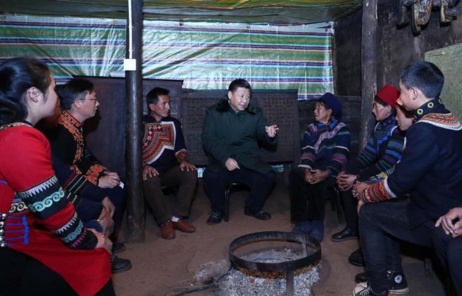 2018年2月11日上午,習(xí)近平在涼山彝族自治州昭覺縣三岔河鄉(xiāng)三河村節(jié)列俄阿木家中同村民代表、駐村扶貧工作隊(duì)員圍坐火塘邊,共謀精準(zhǔn)脫貧之策。新華社記者 鞠鵬 攝