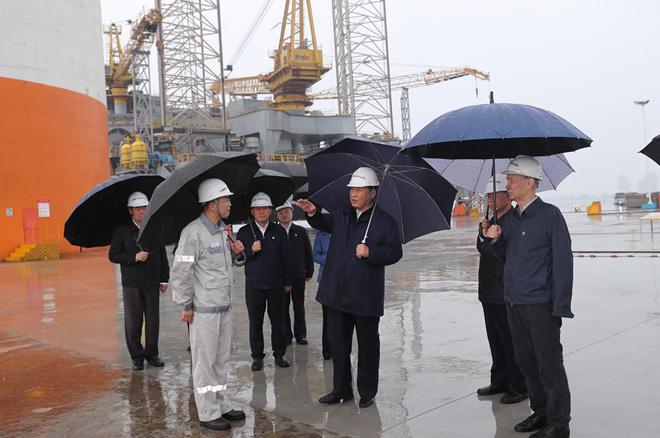 2018年6月13日,習(xí)近平冒雨來到中集來福士海洋工程有限公司煙臺基地,視察海洋工程設(shè)備建設(shè)場地。新華社記者 謝環(huán)馳 攝