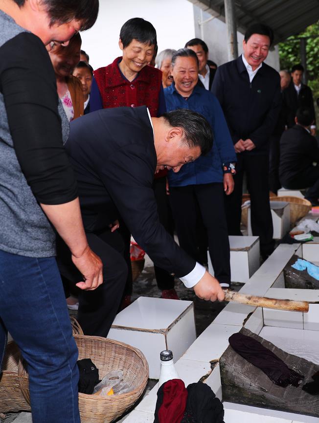 2018年4月24日下午,習(xí)近平在宜昌市許家沖村考察時,在便民洗衣池邊用棒槌試著捶打衣服。新華社記者 謝環(huán)馳 攝