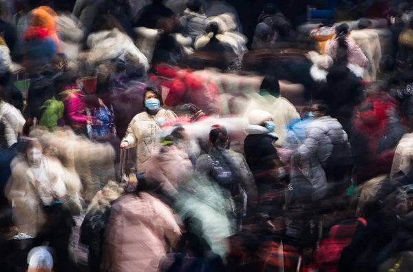 2020年1月22日,在湖北省武漢市漢口火車站,旅客戴口罩進站乘車。1月23日,武漢宣布暫時關(guān)閉離漢通道,在全國鼎力支持下,進入“隔一座城、護一國人”的攻堅階段。新華社記者 肖藝九 攝