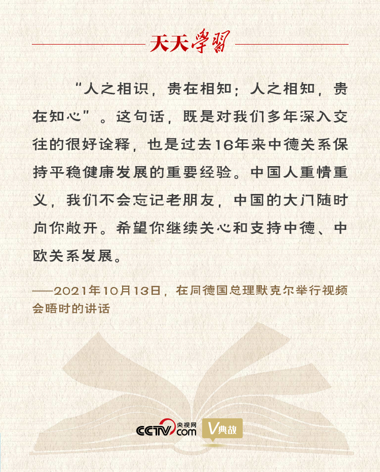 10月13日,習近平主席同德國總理默克爾舉行視頻會晤。雙方在友好的氛圍中回顧近年中德、中歐關(guān)系發(fā)展并就相關(guān)問題深入交換意見。習主席積極評價默克爾任內(nèi)為推動中德、中歐關(guān)系發(fā)展所作的貢獻,并引用“人之相識,貴在相知;人之相知,貴在知心”,稱這句話“既是對我們多年深入交往的很好詮釋,也是過去16年來中德關(guān)系保持平穩(wěn)健康發(fā)展的重要經(jīng)驗”。