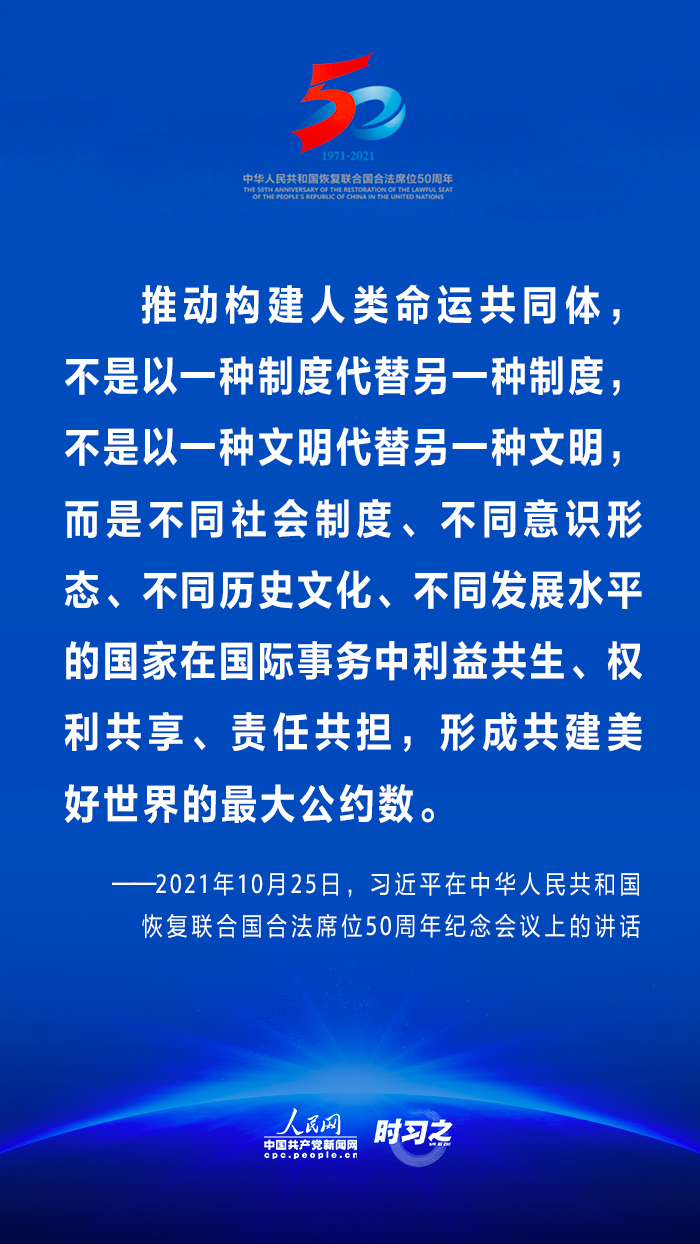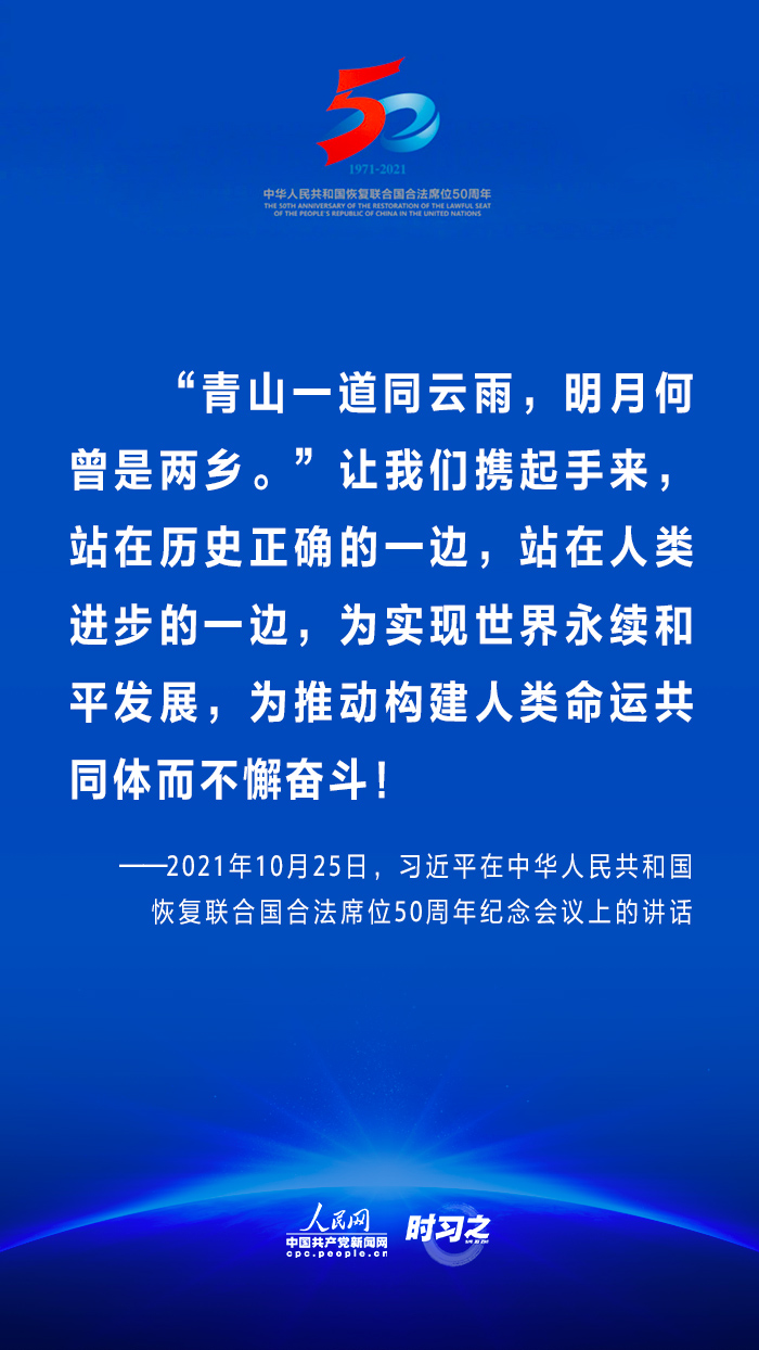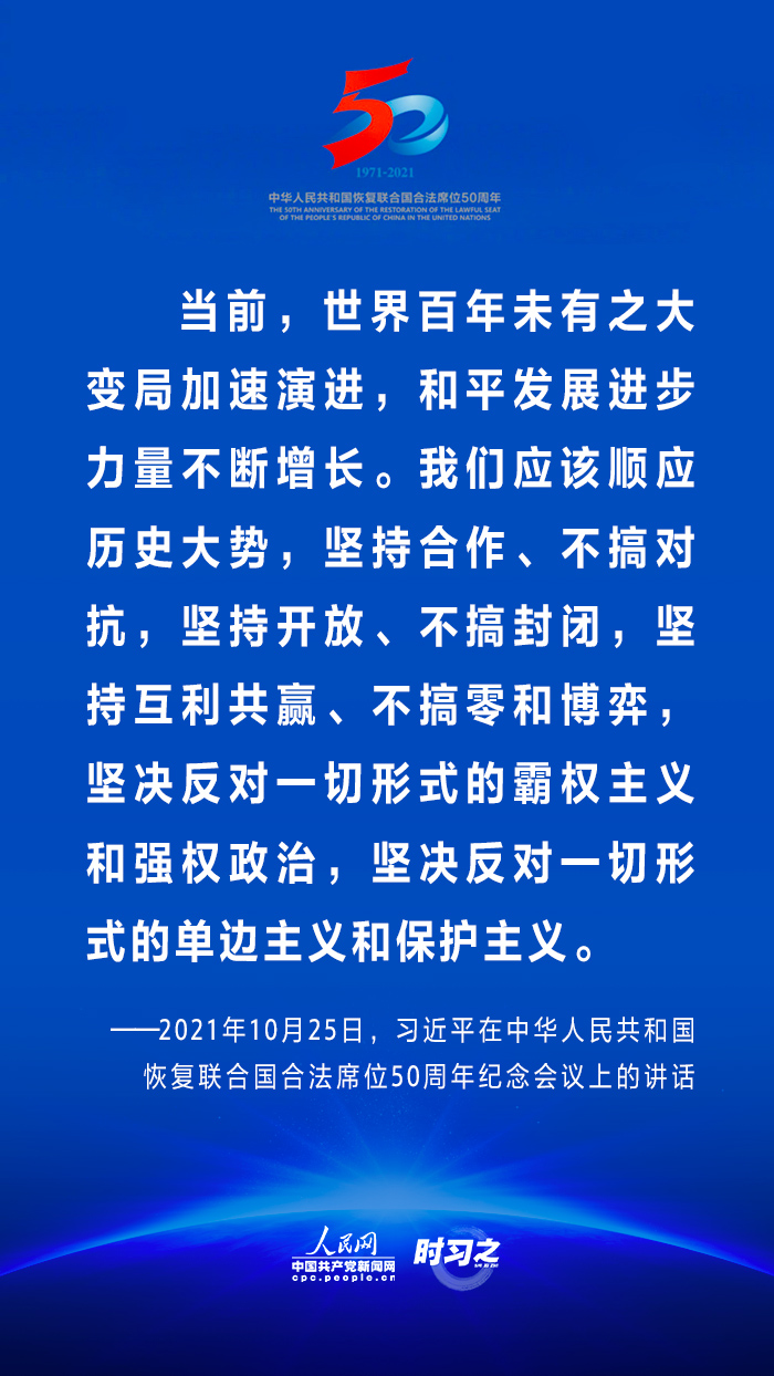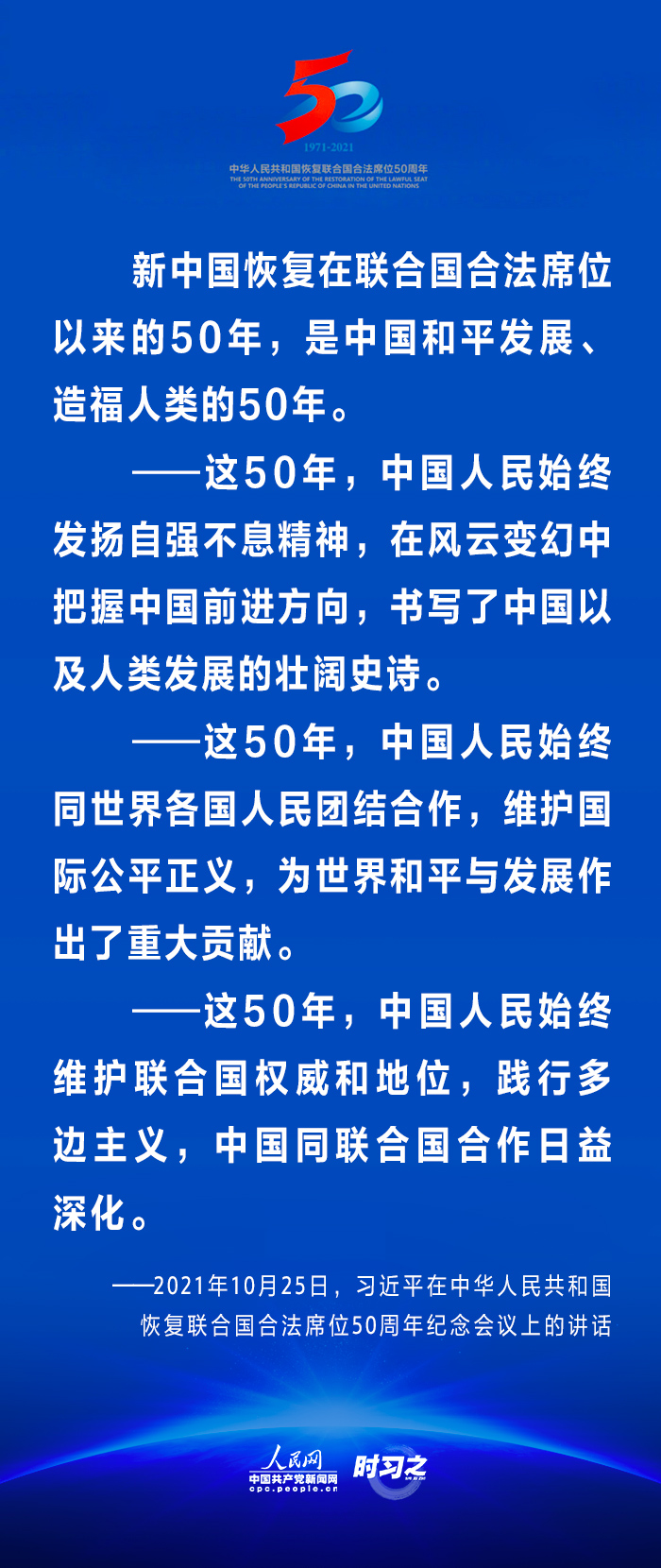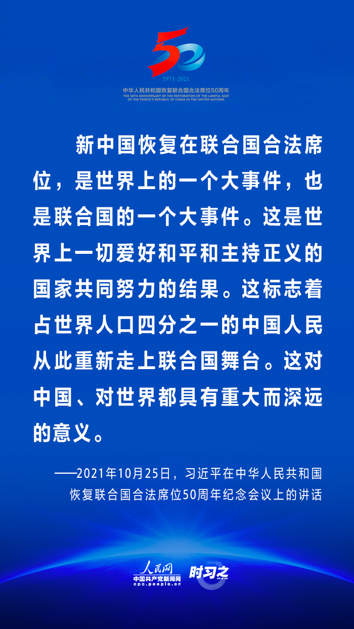 10月25日,國(guó)家主席習(xí)近平在北京出席中華人民共和國(guó)恢復(fù)聯(lián)合國(guó)合法席位50周年紀(jì)念會(huì)議并發(fā)表重要講話(huà)。在講話(huà)中,習(xí)近平回顧了中華人民共和國(guó)恢復(fù)在聯(lián)合國(guó)合法席位50年以來(lái)的重大成就,面對(duì)百年未有之大變局,重申中國(guó)將始終做世界和平的建設(shè)者、全球發(fā)展的貢獻(xiàn)者和國(guó)際秩序的維護(hù)者。