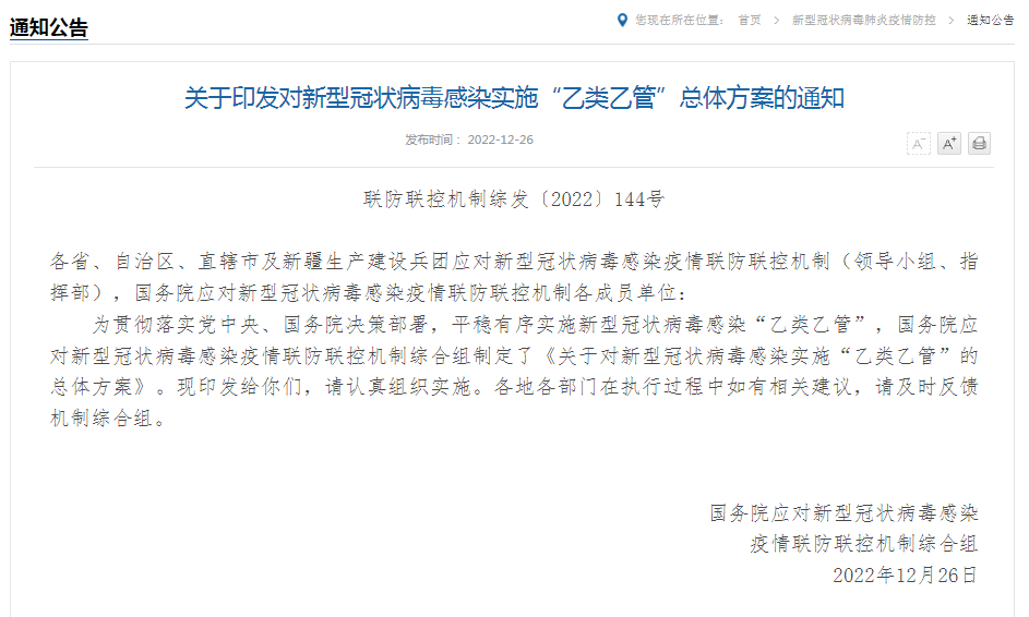 關于印發(fā)對新型冠狀病毒感染實施“乙類乙管”總體方案的通知