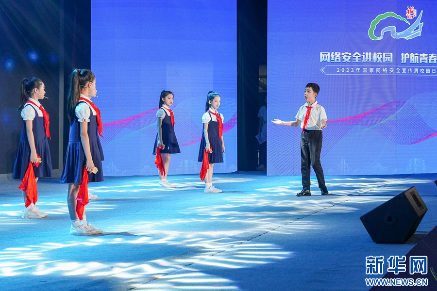 9月12日,校園日活動啟動儀式上,學(xué)生表演“文明凈網(wǎng)”主題音樂快板節(jié)目。新華網(wǎng) 肖和勇 攝