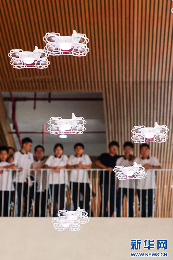 9月12日,福州第三中學(xué),師生操作無人機進(jìn)行編隊飛行表演。新華網(wǎng) 肖和勇 攝