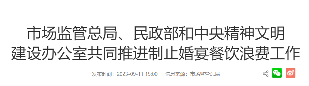 《通知》強(qiáng)調(diào),各級(jí)市場(chǎng)監(jiān)管部門、民政部門和文明辦要加強(qiáng)制度供給,強(qiáng)化對(duì)婚宴服務(wù)經(jīng)營(yíng)者的日常監(jiān)管和行政指導(dǎo),做好新人結(jié)婚登記時(shí)的提示提醒,積極營(yíng)造浪費(fèi)可恥、節(jié)約為榮的氛圍,促進(jìn)制止餐飲浪費(fèi)成為全社會(huì)的行動(dòng)自覺(jué)。