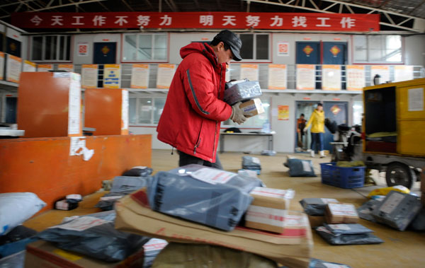 11月11日早晨,馬林在快遞公司對所轄片區(qū)的貨物進(jìn)行分揀、裝車。