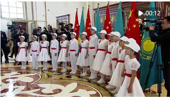 十余名哈薩克斯坦少年兒童用中文演唱《歌唱祖國》,熱烈歡迎習(xí)近平主席到訪。