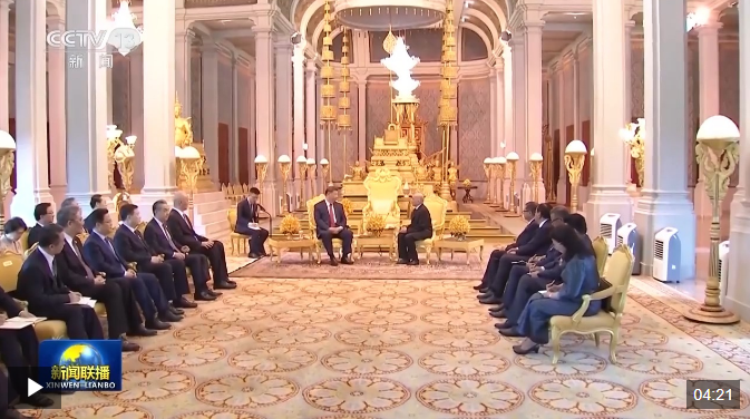 4月17日下午,柬埔寨國王西哈莫尼同中國國家主席習(xí)近平在金邊王宮舉行會見。