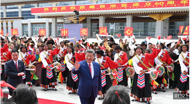 習近平離開西藏時,各族群眾紛紛來到拉薩市區(qū)的沿途道路兩旁,揮舞紅旗、手捧哈達,歡呼著向總書記問好,向總書記表達由衷的愛戴。拉薩貢嘎機場,身著節(jié)日盛裝的干部群眾揮舞著紅旗和花束,載歌載舞,高喊“扎西德勒”,表達高原兒女對以習近平同志為核心的黨中央的感激之情、對建設社會主義現(xiàn)代化新西藏的堅定信心。